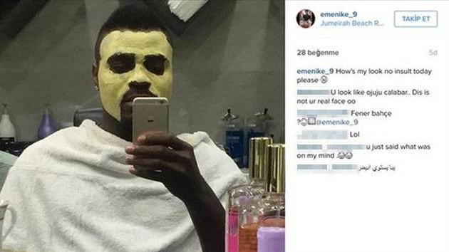 Kendisine cilt bakımı yaptıran 28 yaşındaki oyuncu, yüzmaskesiyle poz verdi ve "Görünüşüm nasıl? Bugün hakaret etmeden yorum yapın lütfen" yazdı. Emenike'nin bu pozu yüzlerce kez Facebook ve Twitter'da paylaşıldı.
